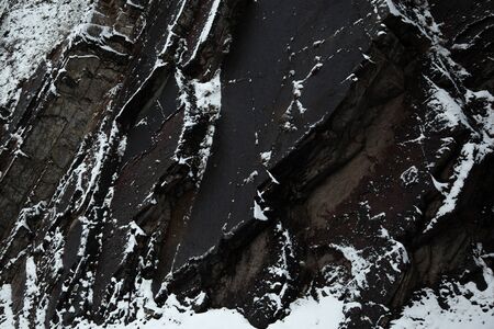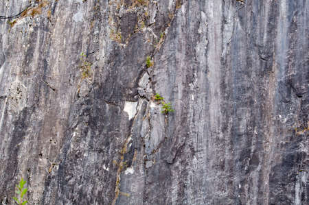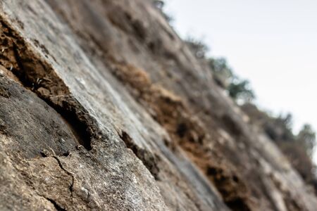Natural background. Closeup edged shabby cliff cracks. Gray-brown stone rock texture of mountains. Vintage and faded matt style colour in tinted photo. Concept of geolog, mountaineering or hard work