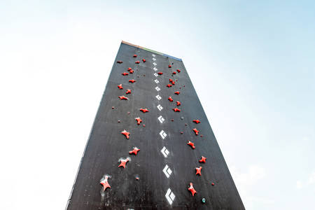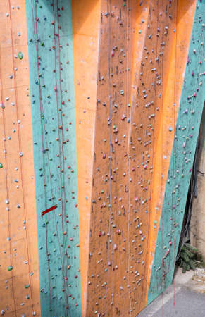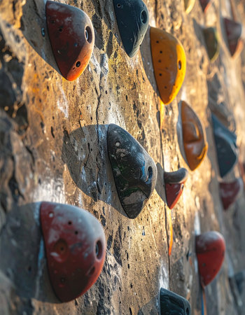 The warm, golden light of late afternoon illuminates a textured climbing wall, highlighting the colorful holds that map out a path of challenge and determination.