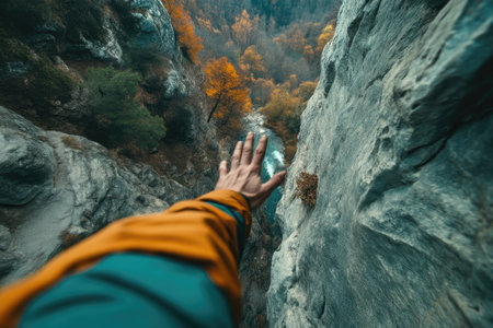 A man in outdoor recreational gear climbing a rock face, AI-generated.