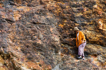 Travelers thai women people travel visit rest relax and hiking trekking trail climb and take photo with stone cliffs rock mountain of Khao Lon Adventure forest at Sarika city in Nakhon Nayok, Thailand
