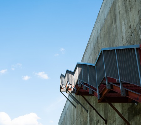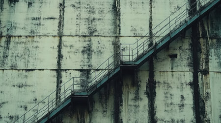 A detailed view of a rusty staircase ascending a weathered industrial wall, showcasing textures and grunge that represent urban decay and history.