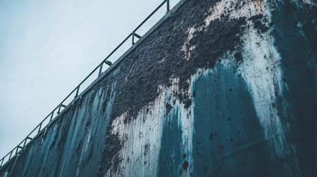 Captivating low angle view of a weathered concrete structure under an overcast sky, showcasing the grandeur and industrial design elements in a dramatic perspective.