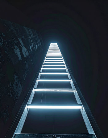 A low-angle view captures a modern, illuminated staircase ascending into the deep darkness.