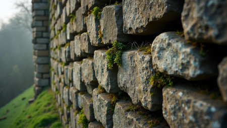 Mystical medieval castle wall with weathered stones and delicate greenery