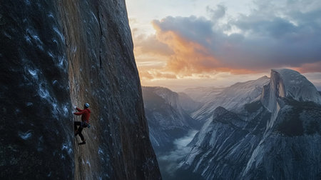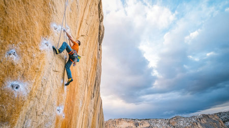 Scaling a steep rock wall with a vibrant sky in the background, a climber exudes strength and adventure in a dramatic scene