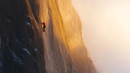Rock climber overcomes challenging route on a rocky wall at sunset