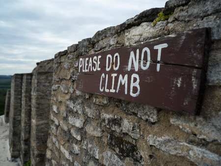 Do Not Climb warning sign on ruined wall, Ancient Mayan Archaeological Site, San Jose Succotz, Cayo District, Belize