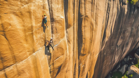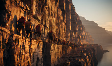 Man Climbing Up Side of Mountain, A network of ropes and anchors snakes its way up the cliff, a testament to the teamwork and preparation required for a successful ascent