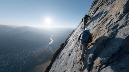 Two adventurers tackle a steep rocky mountain during sunrise, showcasing determination and teamwork with breathtaking views of the surrounding valley.