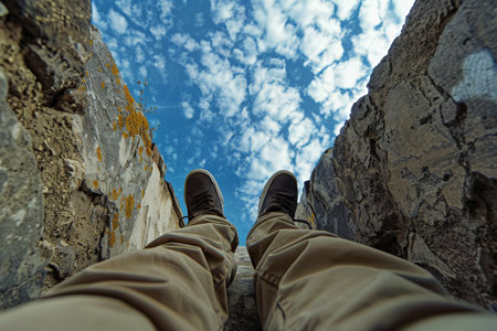 A person's legs dangle from a stone wall, with a vivid blue sky and scattered clouds creating a striking perspective.
