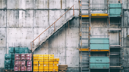 This image features a construction site with colorful stacked containers beside a scaffold against a concrete wall, showcasing urban development and industrial elements.
