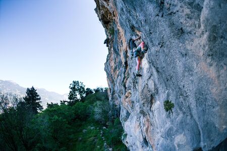 A strong girl climbs a rock, Rock climbing in Turkey, Training endurance and strength, Woman in extreme sport, Rock climber is training in nature.