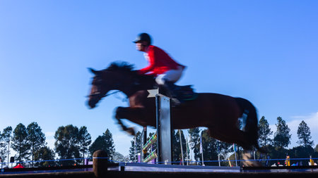 Show jumping horse rider in red jacket flight over gate motion speed blur photograph.