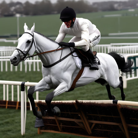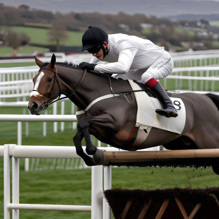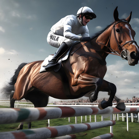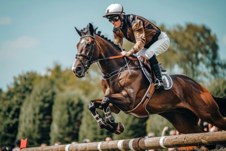 A thrilling moment of a rider skillfully navigating a jump on a horse, showcasing speed and agility in a vibrant outdoor setting.