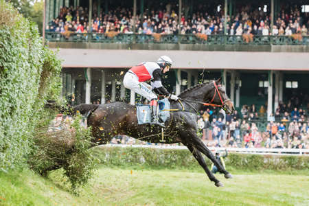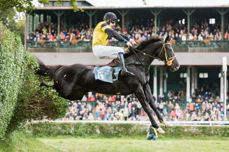 WROCLAW, POLAND - OCTOBER 16; 2021: Steeplechase race Crystal Cup for five years old horses and older at Racecourse WTWK Partynice. Jockey L. Matusky on horse Nick.