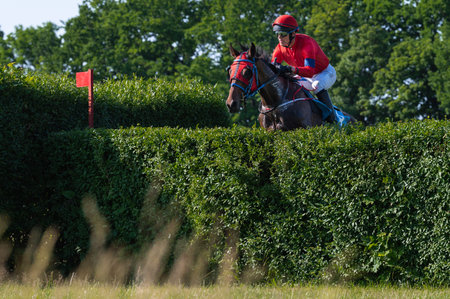 WROCLAW, POLAND - JUNE 4; 2023: Racecourse WTWK Partynice. International race with obstacles for four years old horses. Jockey Niklas Loven on horse Et Tu Brute.
