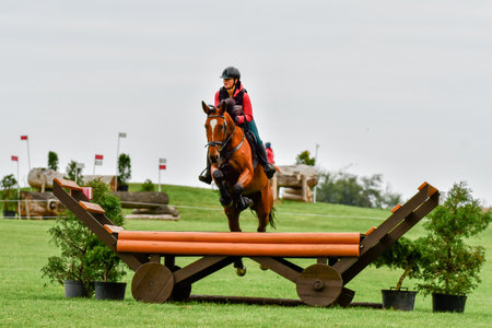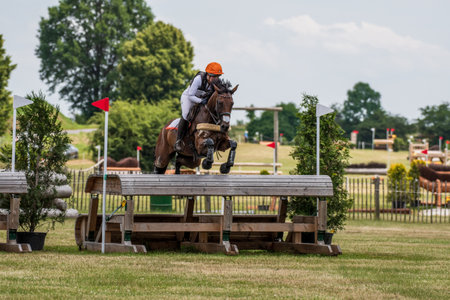 Rider approaches cross-country jump with determination vivid course colors intense concentration competitive spirit