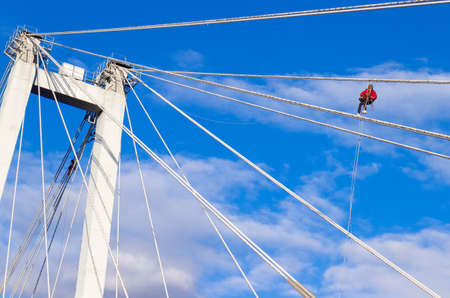 Krasnoyarsk, Russia - October 28, 2021: industrial climber work on the cables of the suspension bridge. Working in height against blue sky background