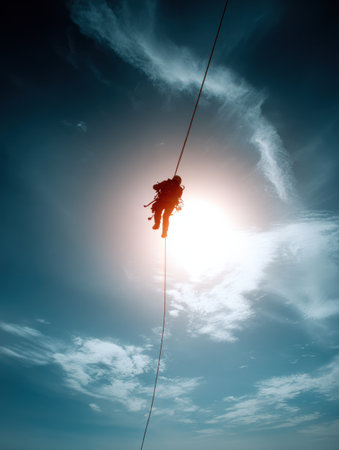 A daring adventurer performs abseiling from a steep height in an isolated setting. This striking silhouette captures the thrill and excitement of outdoor sports, showcasing the unique experience of descent. Ideal for adventure and sports themes.