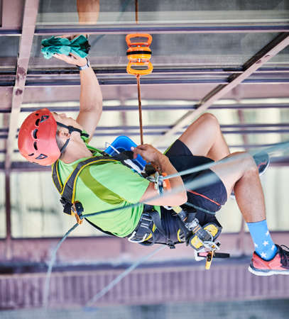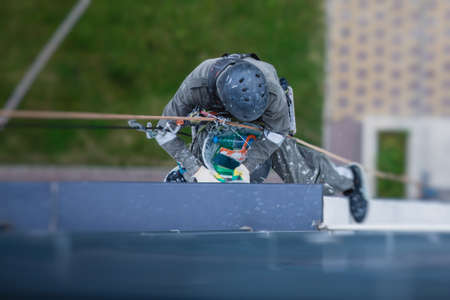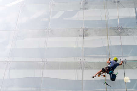 Industrial mountaineering. A working mountaineer with equipment, helmet and special clothing climbs a tall glass building.