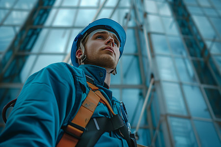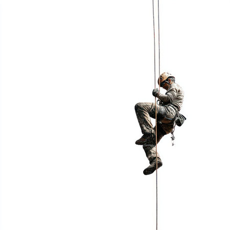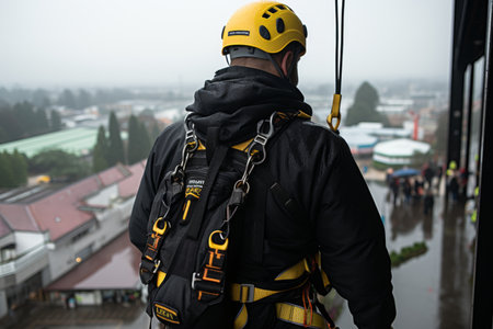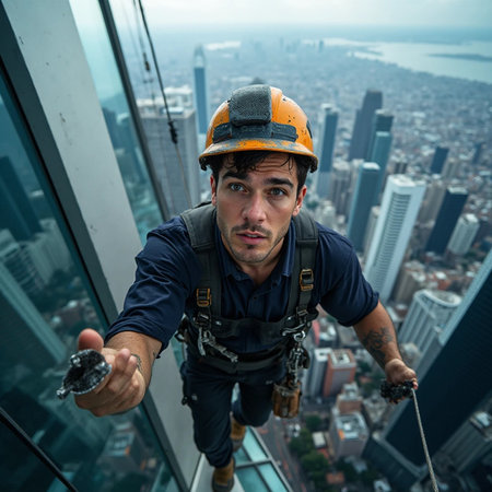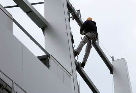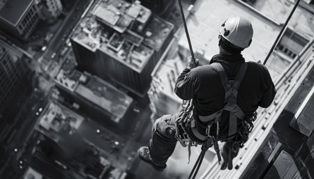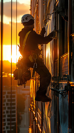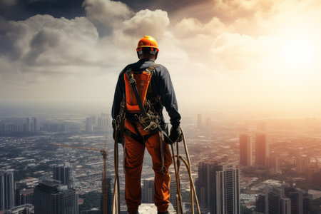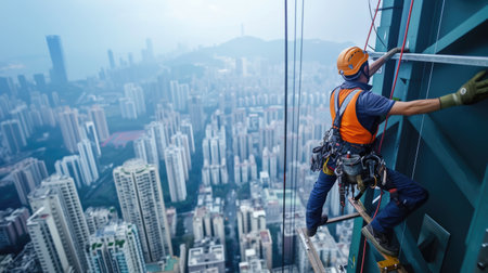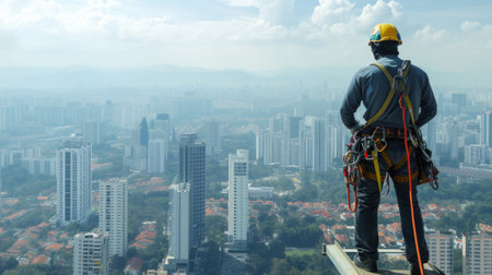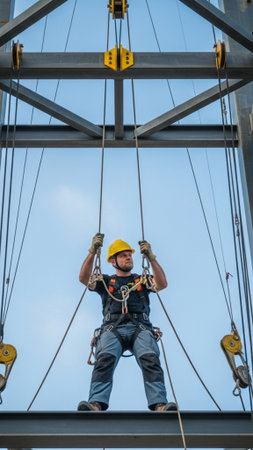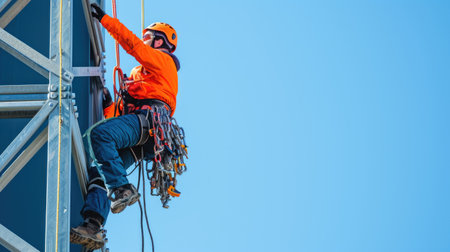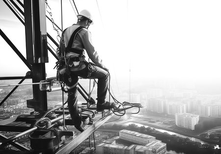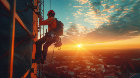 Skilled worker with climbing and safety gear, tackling high-altitude tasks on a construction site, underscoring the importance of safety