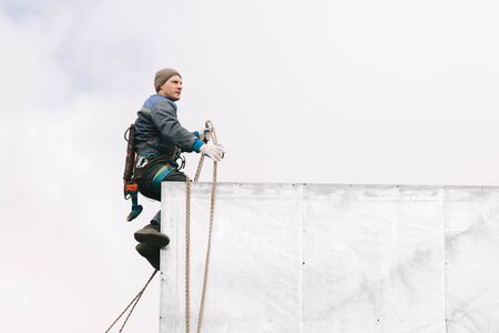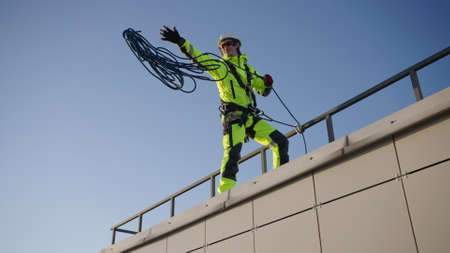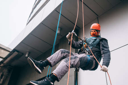 Industrial climber in bright suit descends using safety ropes after completing work at height. The industrial climber work is complete. Ending the workday at height