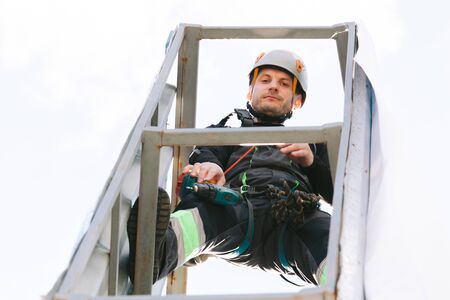 Industrial climber repair billboard. Risky job. Work on height. Metal construction. Electric screwdrive.