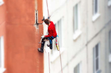 Professional climber rope access worker painting and repairing the facade of residential high rise building exterior facade wall, industrial mountaineer working at heights, highly risky job