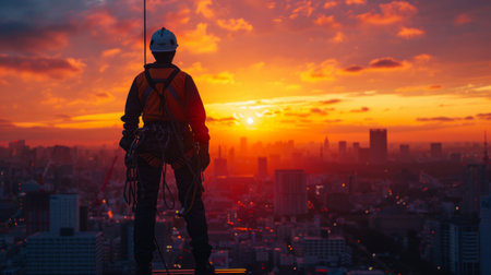 Construction Worker at Height Securing a Skyscraper at Sunset