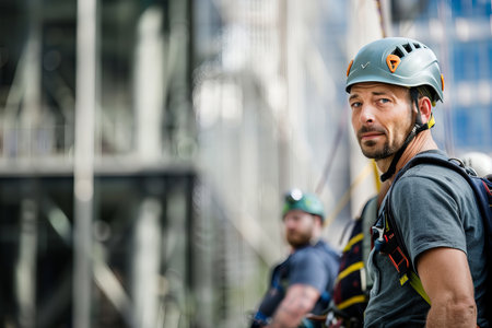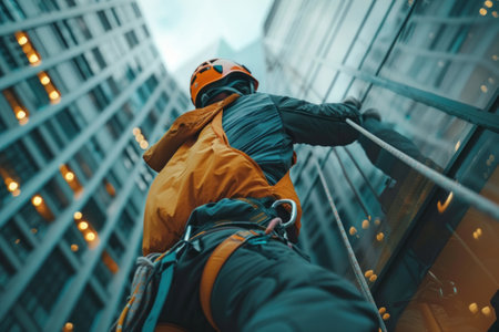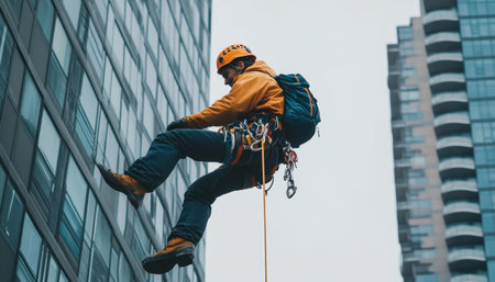 A construction engineer rappels down a tall building using a safety rope for inspection purposes