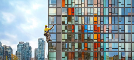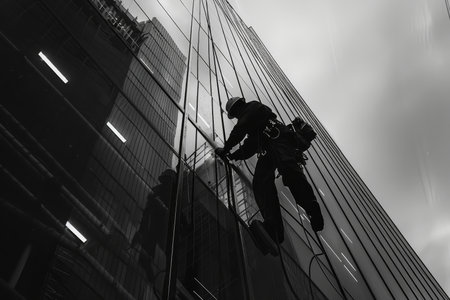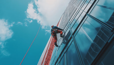 Experienced window washer meticulously cleaning windows on the exterior of a towering building