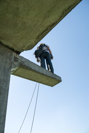 A working at height equipment, Construction worker wearing safety gear working at construction site.