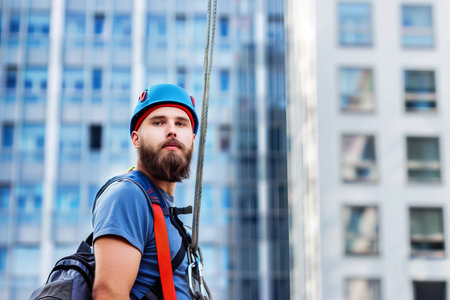 Construction engineer rappelling down a tall building with rope during a project inspection
