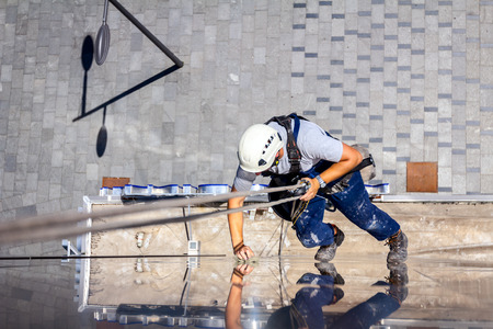 Industrial mountaineering worker washing glass windows of high-rise building, hanging on safety climbing rope. Man window cleaner in protective helmet cleaning skyscraper facade. Top view.