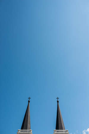 Christian church cross in high steeple tower for prayer, photography consisting of beautiful church with cross on steeple tower to sincere prayer, cross steeple tower is church over clear sky