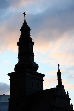Beautiful stone towers of an old gothic building on the background of an ominous twilight sky