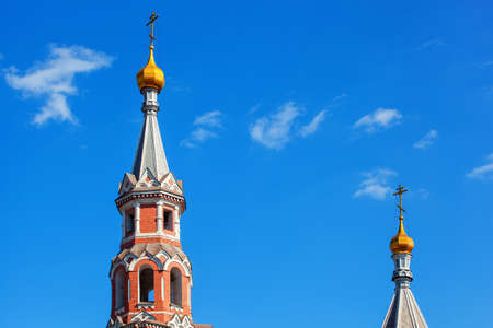 Domes of Church of St. Nicholas against blue clear sky, 1st Golutvinsky lane, Moscow, Russia