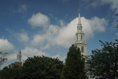 A beautiful church steeple rises against a vibrant blue sky filled with soft white clouds, conveying a sense of tranquility and spirituality in the landscape.