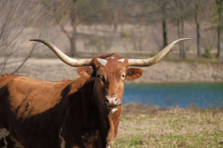 Lonhorn cow with texas field in background.