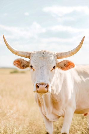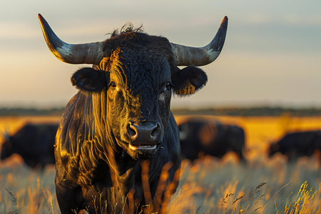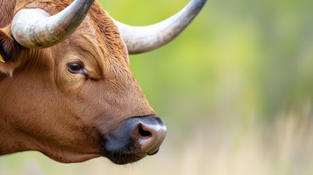 A striking close-up of a bull showcases its strong features and impressive horns, as it stands in a serene farm pasture with an expansive backdrop. Nature's beauty surrounds this majestic creature.