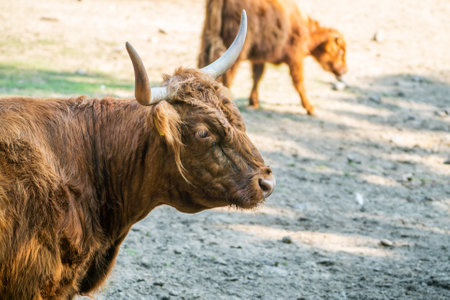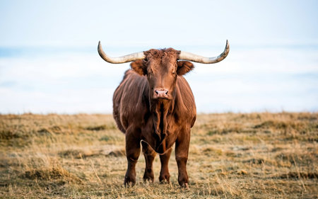A close up of a brown bull with large horns, high quality, high resolution