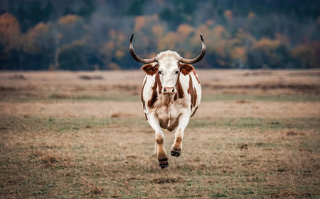 A majestic longhorn cow stands stoically on the grassland, its impressive horns defining its rugged grace.
