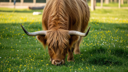 AI Generated. brown highland cow with long horns standing in field looking directly at camera