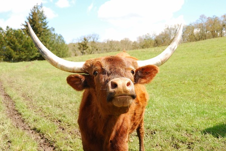 Portrait of a cow with long horns on a green meadow