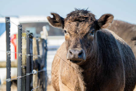 Cute black angus heifer closeup looking at camera with big nose on cattle farm.