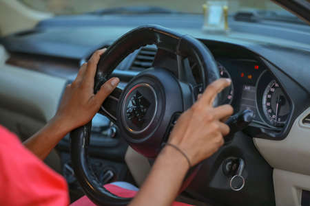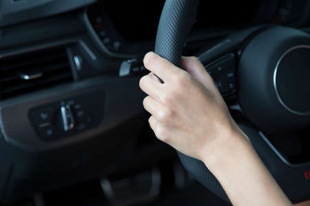 Woman driving a car,Hands of female driver on steering wheel