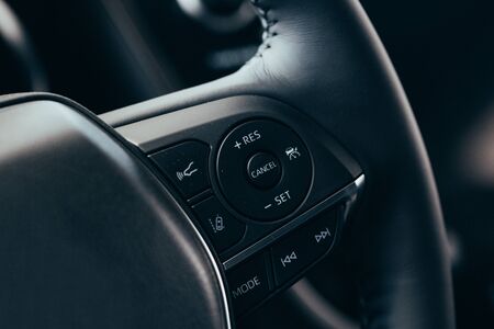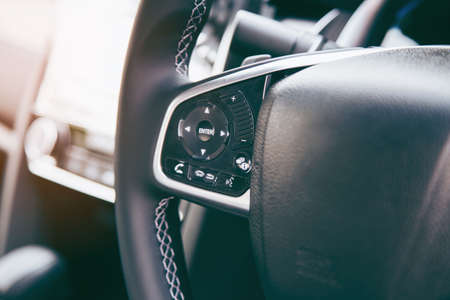 close up Modern black steering wheel with multifunction buttons Integrated stereo controls pushes the for quick control technology in the car.