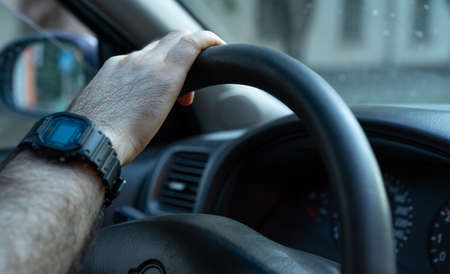 driver hand on the steering wheel inside the car