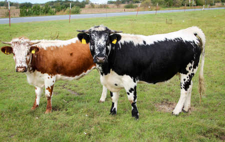 Two brown and white cows in the pasture, closeup