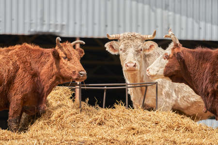 close up view of domestic beautiful cows eating hay in stall at farm